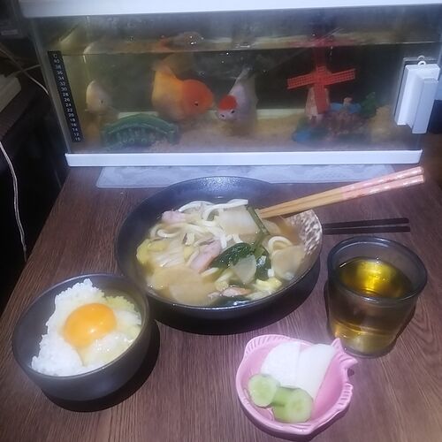 早朝から犬散歩のあと、メダカの世話 月2くらいで水換えもしないとね ガレージ部屋にカッコよく置いてるけど まぁ最近は誰も見に来なくなったなぁ 今朝はオムライス風に、白身魚フライと カネスエのソースが可愛くて使いたくなる 昼は麺にツユをかけるだけ…