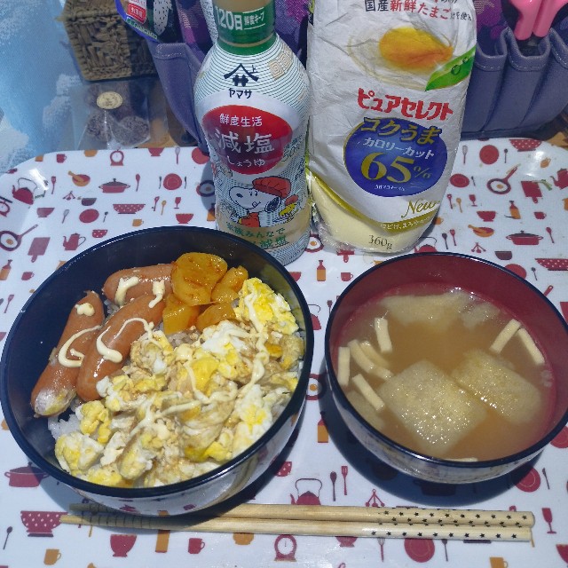 今朝は、ご飯に玉子焼きやウインナー